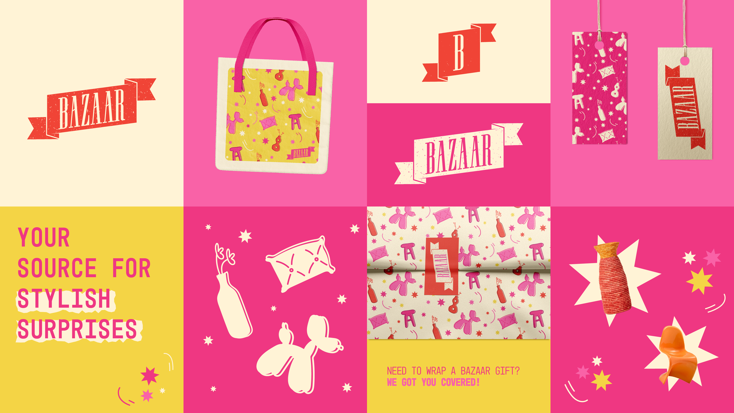 Bazaar is a luxury shop that sells funky home decor and other very giftable artsy things. Striking a balance between luxurious and spontaneous/fun was very important.